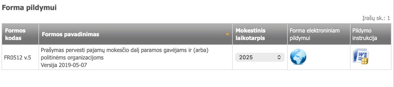 4. Выберите форму FR0512 v.5. Нажмите на глобус под текстом “Forma elektroniniam pildymui” («Форма для электронного заполнения»)