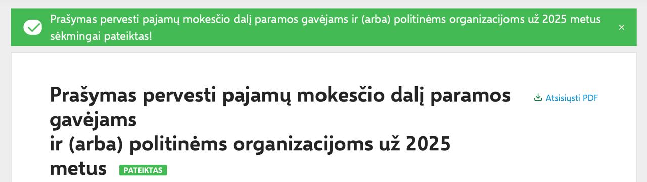 Далее вы увидите выбранного получателя помощи Labdaros ir paramos fondas Bysol (305670484) и сумму той части подоходного налога, которую получит фонд. Нажмите зеленую кнопку «Pateikti» («Отправить»).