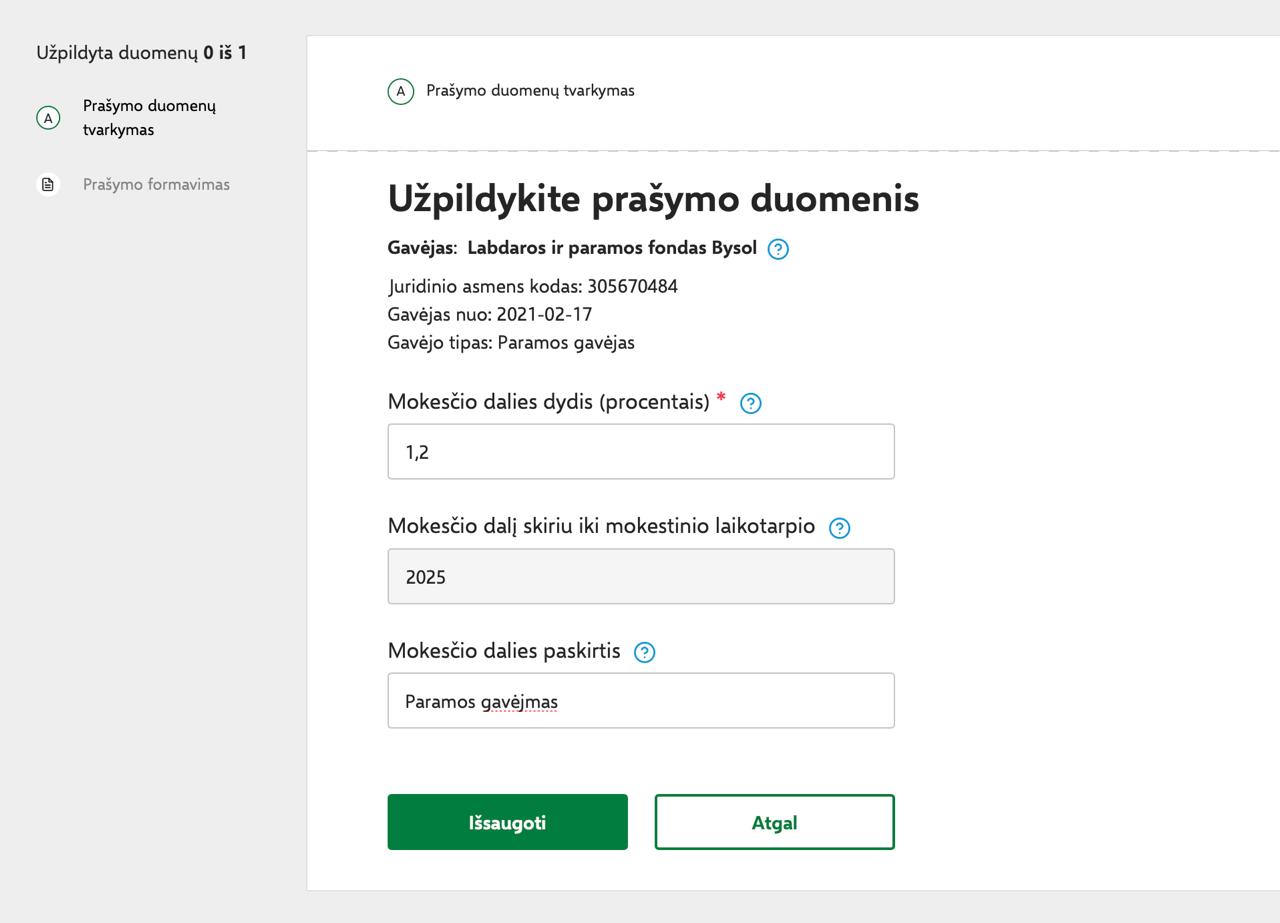 — В поле «Mokesčio dalies dydis procentais» («Размер доли налога в процентах») введите 1,2%.