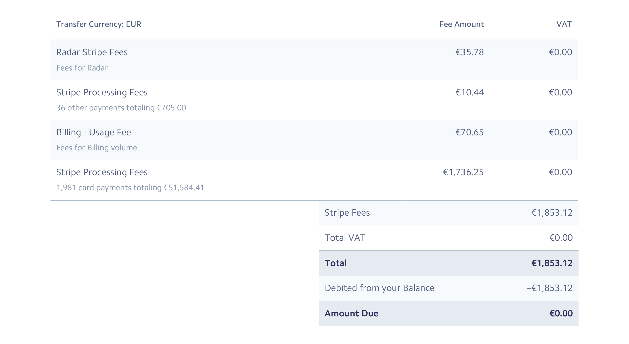 Пример комиссий Stripe за один из месяцев в 2025 году. Сумма комиссии составила 3.54%