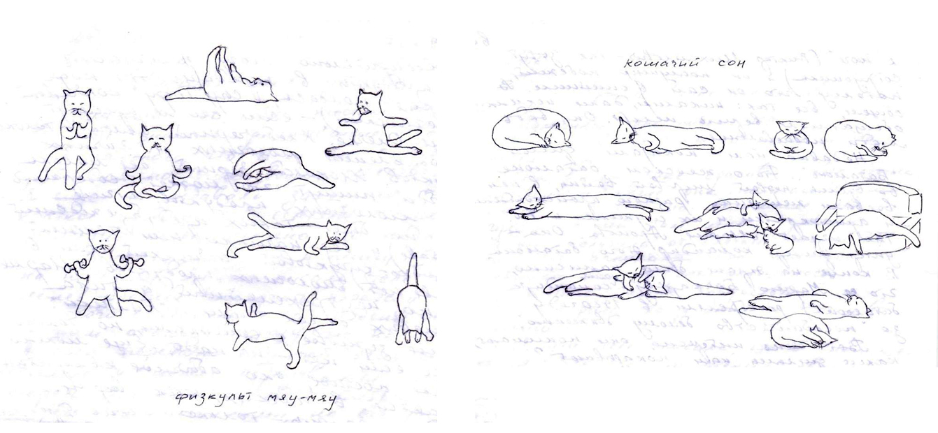 И, знаете, в колонии много котов, они там на «свободном выгуле». Я за ними наблюдала, а потом по памяти рисовала — в каких-то позах, как они друг с другом общаются, какие у них возникают отношения. Я решила с помощью котов описывать то, что происходит у нас.