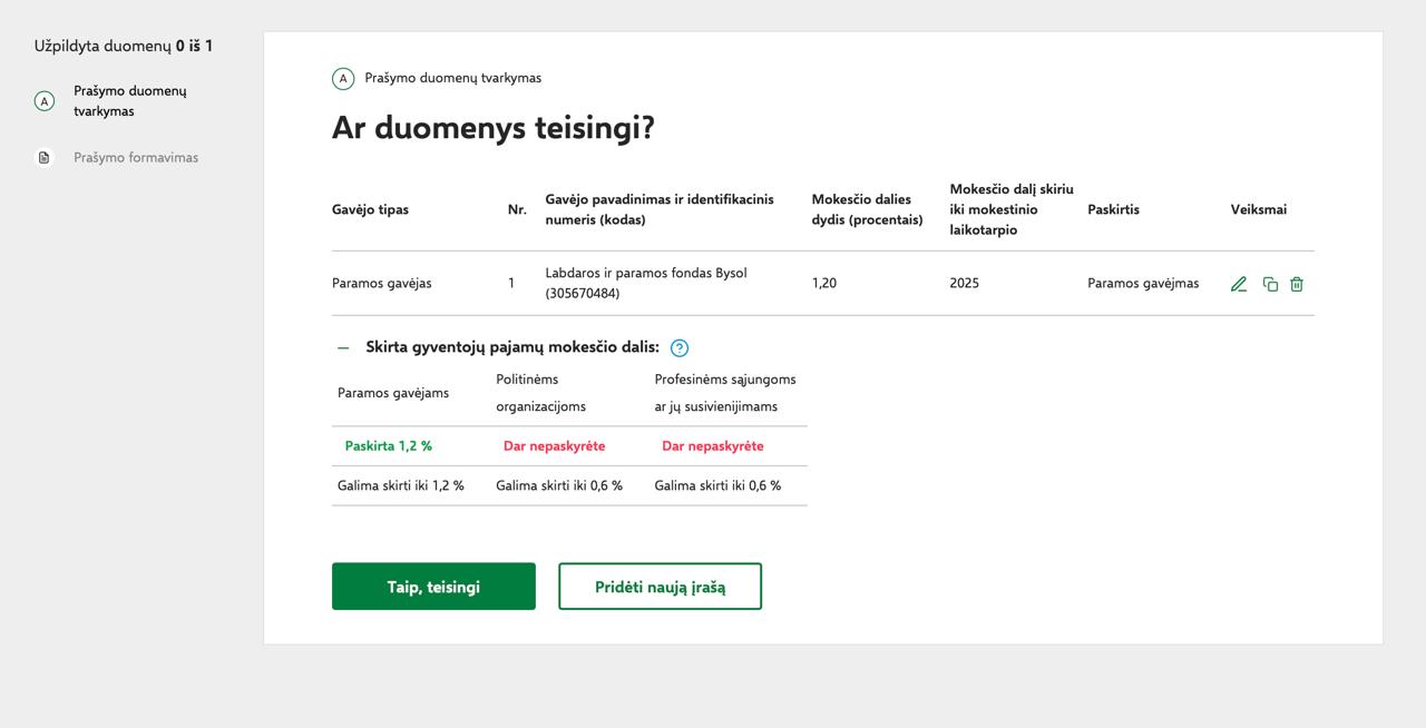 Далее вы увидите выбранного получателя помощи Labdaros ir paramos fondas Bysol (305670484) и сумму той части подоходного налога, которую получит фонд. Нажмите зеленую кнопку «Pateikti» («Отправить»).